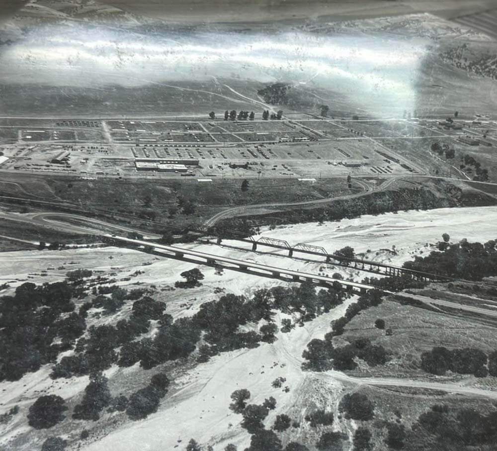 An aerial photo of the bridge near the Salinas riverbed.